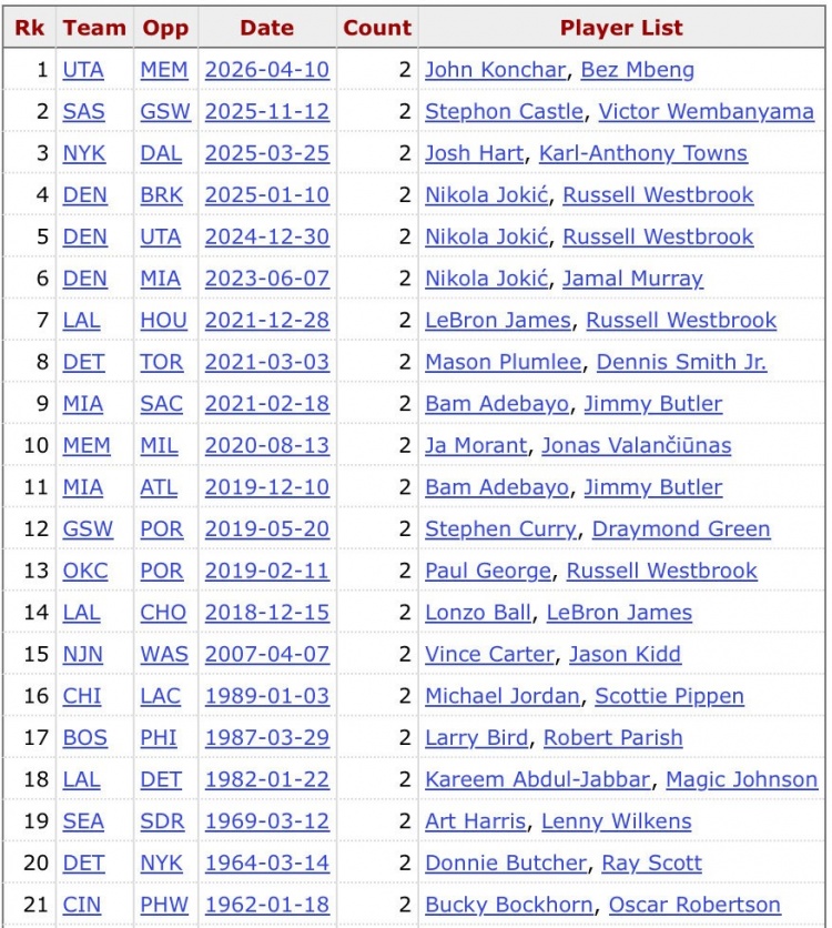 根据数据统计,这是NBA历史首对在同场比赛里以替补身份双双砍下三双的队友,同时也是第21次出现同队三双的情况。